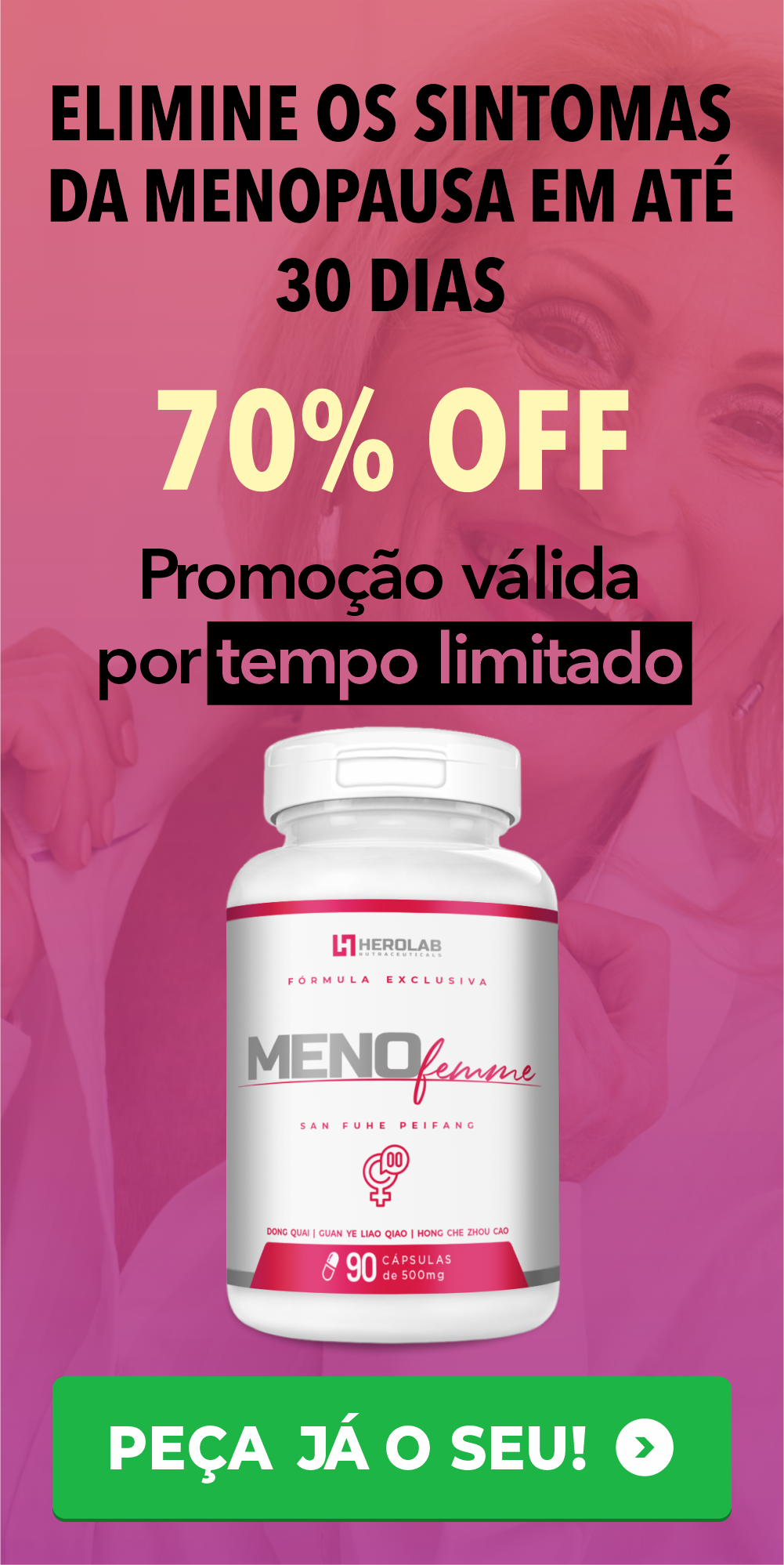 O MENOfemme® é um produto 100% natural e sem efeitos colaterais, com uma fórmula avançada e extremamente assertiva, possui a perfeita combinação de elementos da Medicina Tradicional Chinesa que causam o bem-estar da mulher que o consome com frequência, além de garantir uma disposição INCRÍVEL para seu corpo! Ele foi exclusivamente desenvolvido para proporcionar o alívio máximo dos sintomas da menopausa como ondas de calor, suores noturnos, insônia, ansiedade, estresse, mudança de humor, dores de cabeça e no corpo, falta de libido, ganho de peso, queda de cabelo, entre outros.a.